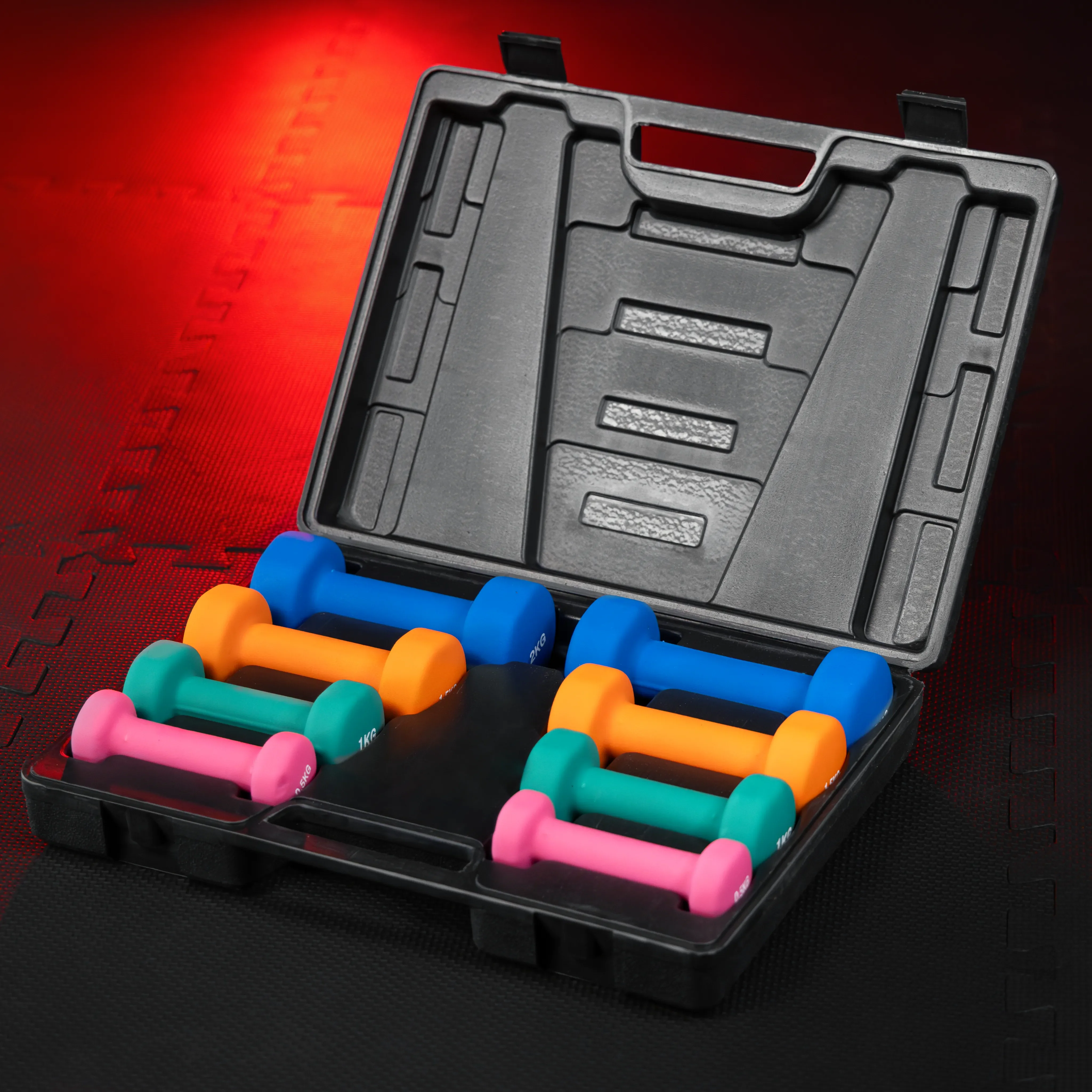 Der graue Koffer bietet vier Hantelpaare unterschiedlicher Größen und Gewichtsklassen Platz, die bereits im Set enthalten sind. Jede der leuchtend bunten Farben entspricht einem anderen Gewicht zwischen 0,5 und 2 Kilogramm. Mit diesem Set sparst Du Platz und schaffst gleichzeitig Ordnung. Du kannst Dein Zubehör auf einen Griff schnappen, um zum Beispiel mit Freunden oder Outdoor zu trainieren.