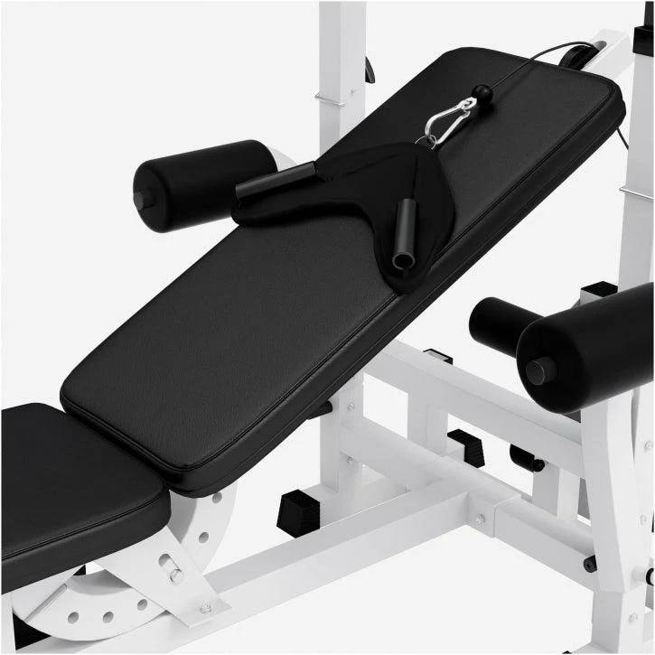 Die stabile Konstruktion dieser Multifunktionsbank mit gummierten Füßen sorgt für Sicherheit bei intensiven Trainingseinheiten, während das schlichte weiße Design Deinem Zuhause einen eleganten Touch verleiht. Die 170 cm lange Langhantelstange aus massivem Stahl hilft Dir, Deinen gesamten Körper zu stärken.